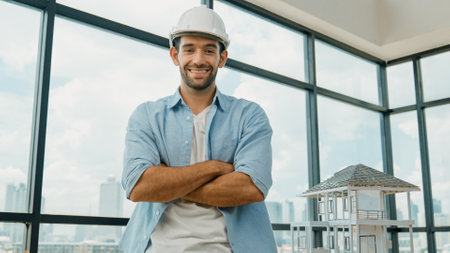 Portrait of architect engineer in casual outfit smile at camera while crossing arms. Engineer looking at camera and sitting with arms folded near house model while wearing safety helmet. Tracery
