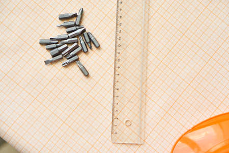 Desktop, drawing, tools, helmet, ruler, table, nails.
