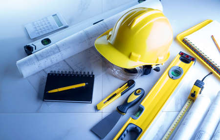Contractor theme. Plans, notebook and tool kit of the contractor: yellow hardhat, libella and yardstick.