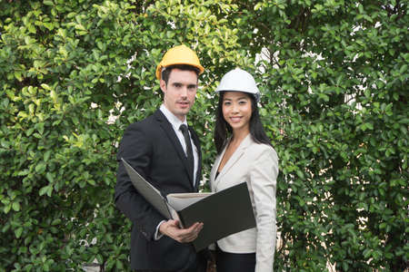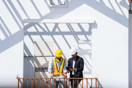 Engineers are discussing data working and tablet or laptop with architectural project at new construction site,Engineering tools and construction concept.
