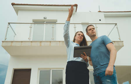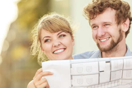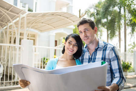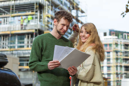 Real estate and family concept - young couple on front of new big modern house construction site with blueprint project keys dreaming about home