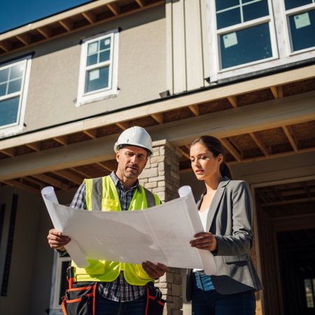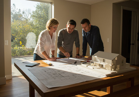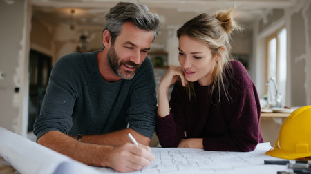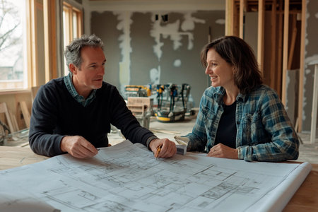 Two professionals share ideas while examining architectural plans in a nearly completed room. Sunlight streams through large windows, illuminating their focused discussion on the renovation project.