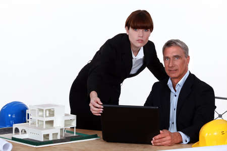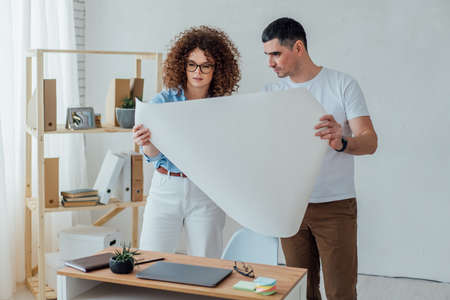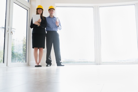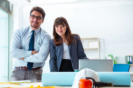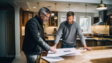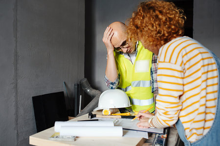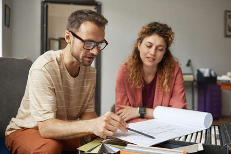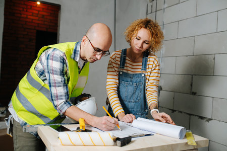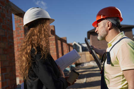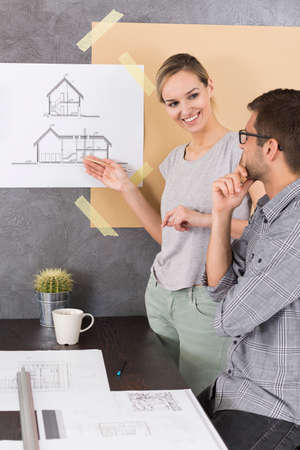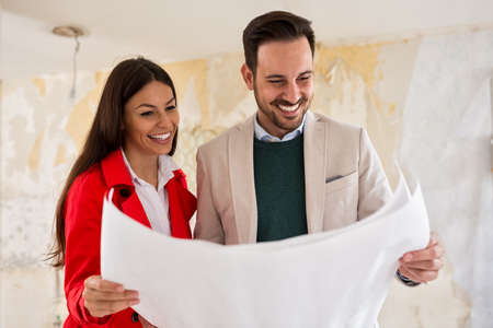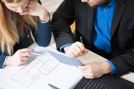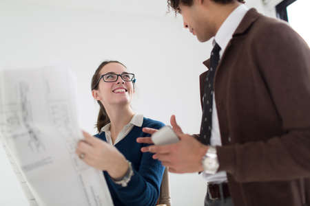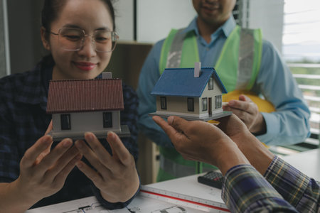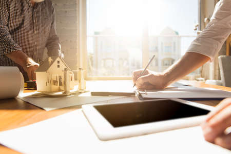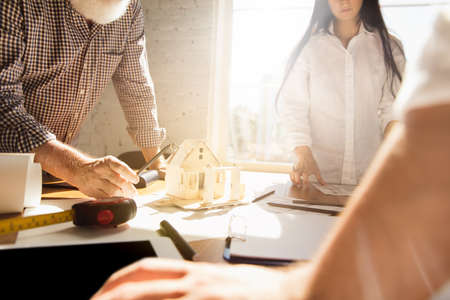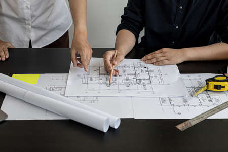 Architects and engineers are discussing house plans designed to verify accuracy and to meet design and construction standards. Interior design and decoration ideas.