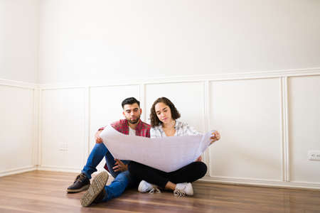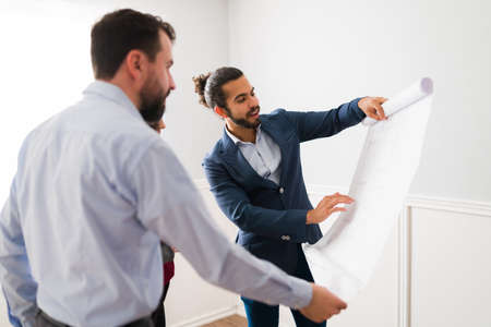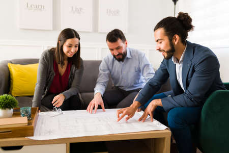 Professional realtor showing the architectural plans to a couple looking to buy a new house