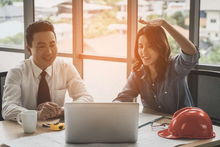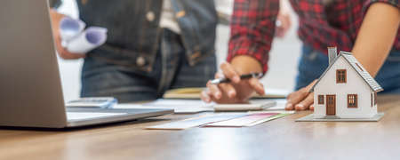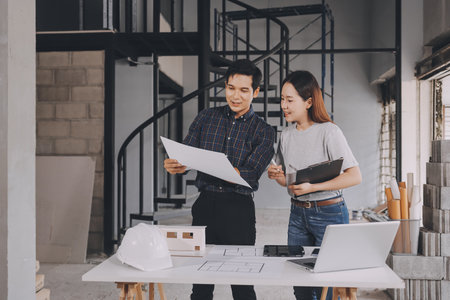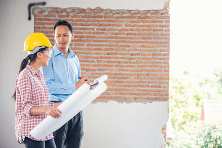 consulting meeting of two smart male female asian interior designer or achitect with blueprint home mockup and material sample with happy at house renovate improvement site construction background