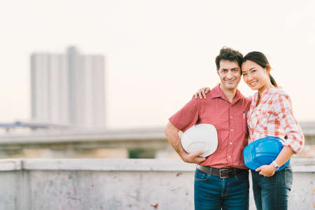 Multiethnic couple of construction engineers at construction site or factory at sunset, industrial occupation or love relationship concept. With copy space