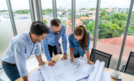 Engineers team meeting for architectural project. architects discussing blueprint with construction manager in office worker conference site. Construction Concept