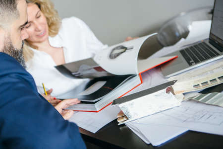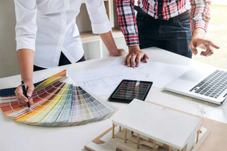Two interior design or graphic designer at work on project of architecture drawing with work tools and color swatches, colour chart, color samples for selection, renovation and technology concept.