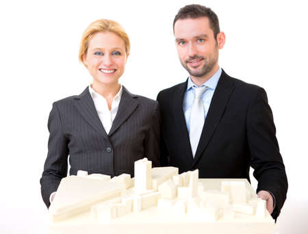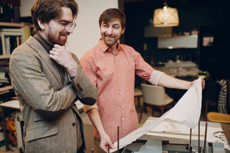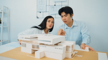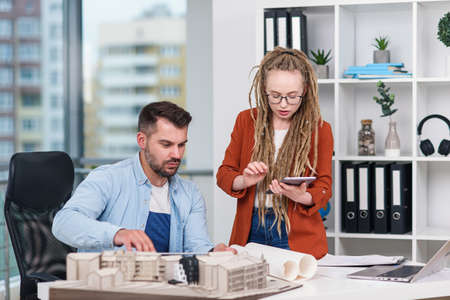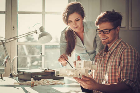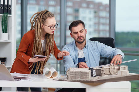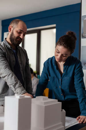 High-skilled hardworking creative male and female designers working with mock-up of future buildings