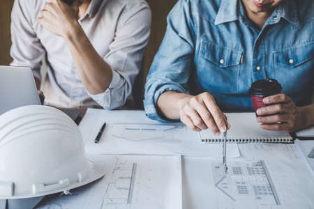 Engineer and architect team meeting with helmet and house on construction tool table With blueprints on the table - successful business collaboration. successful cooperation concep