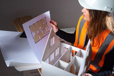Female civil engineer with drawings and layout of the house. Work on a construction project. Female architect. Work in construction. Development of the cottage project.