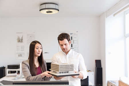 Front view of Caucasian male and female architect discussing over architectural model at table in a modern office. This is a casual creative start-up business office for a diverse team