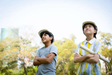 Civil engineer teams meeting working together wear worker helmets hardhat on construction site in modern city. Foreman industry project manager engineer teamwork. Asian industry professional team.
