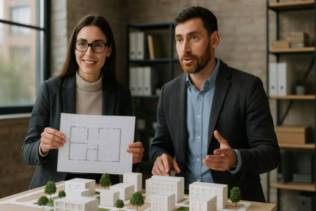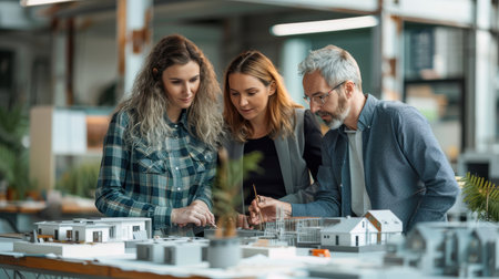 Architects and engineers work together in an office to review blueprints, exchange ideas, and refine their building plans for a contemporary construction project in an urban setting.