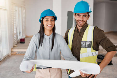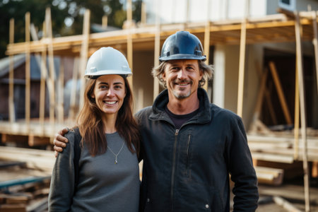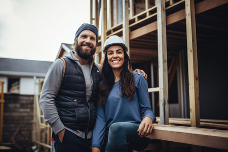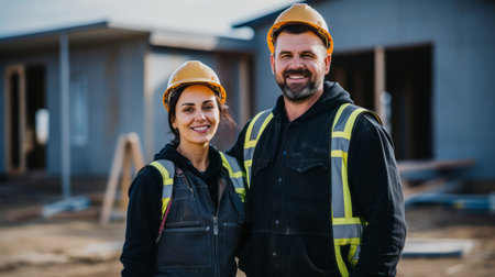 United team of builders: a smiling couple showcasing gender equality in the construction sector