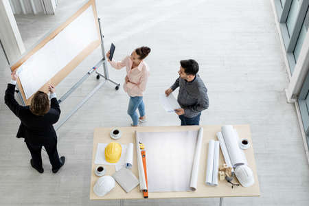 Team of male and female engineers and architects, working team, meeting, discussing construction and drawing construction plans, printing, writing on-site construction sites. Top view.