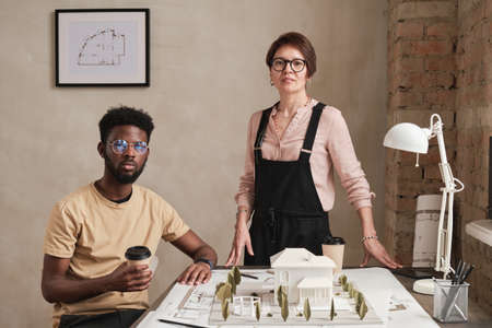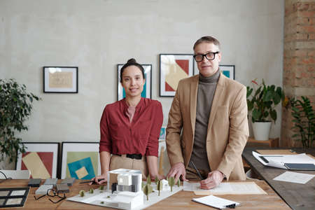 Portrait of confident multi-ethnic architects in smart casual outfits standing at table with samples and maquette while working on new design