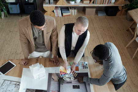Two designers of interior showing color palette to African male client and consulting him in office or architectural bureau