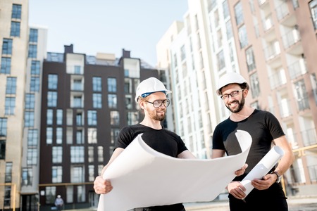 Two buildes in black t-shirts standing with architectural drawings on the new built residential area outdoors