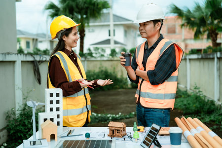 Construction and structure concept of Engineer or architect meeting for project working with partner and engineering tools on model building and blueprint in working site, contract for both companies.