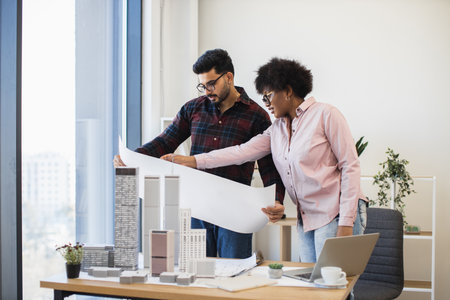 Indian man and African woman architects analyzing blueprints for city development project. Creative teamwork in modern office setting. Collaborative work with model buildings, plants, and city view.