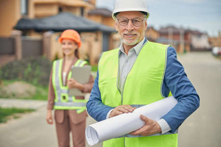 Construction engineering or architect discussing a blueprint and building model while checking information on sketching meeting for architectural project in work site.