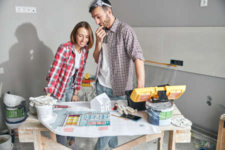 Mid adults couple witj leveler indoors at home, relocation and diy concept.