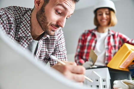 Male architect-engineer presents project of future house for young family. Man working in the office with documents, blueprint. First home, industrial, building concept. Moving to new live place.