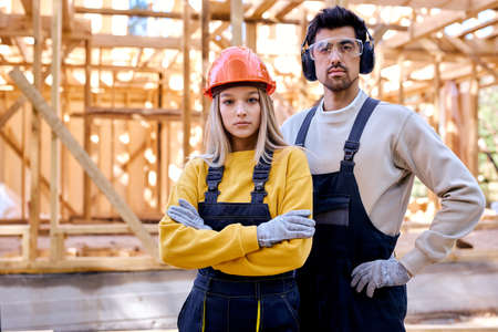 young constructor engineers in New wooden residential construction home framing. Construction site. Attractive caucasian lady and man in unform, hardhat and headset posing at camera, at sunny day