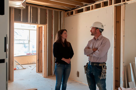 A woman wears casual attire as she engages in conversation with a contractor in a well-lit room undergoing renovations. Drywall and construction tools surround them, indicating progress.