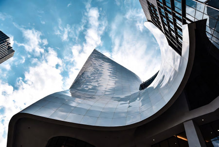 The highrise curved reflective architecture under the brightest clear sky day that a large and uncountable amount of room and curved mirror or curved glass that can reflect light form the sun. AIGX03.