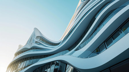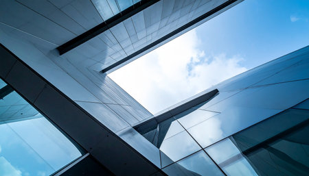 Sleek building showcases contemporary architectural elements with sharp angles and extensive glass panels situated against a backdrop of a bright blue sky highlighting its modern aesthetic.