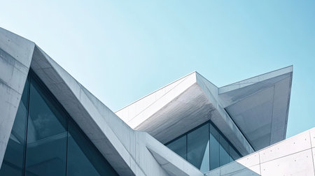 Sleek and minimalist structure showcases innovative architectural design with expansive glass elements. The buildings strong lines and concrete features are highlighted by a bright blue sky.