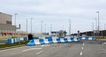 Black and yellow striped traffic bollards on the asphalt (Pesaro, Italy, Europe)
