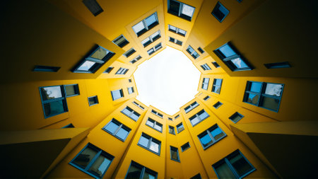 Abstract geometric patterns on a modern building facade, perfect for copy space