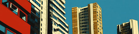 This dynamic representation showcases various architectural styles in an urban setting, highlighting a mix of residential and commercial buildings. The structures feature bold colors and distinct materials, creating an engaging visual contrast against a bright blue sky.