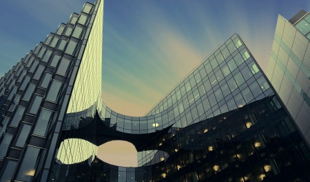 Abstract image of looking up at modern glass and concrete building. Architectural exterior detail of office building. Industrial art and detail. Sunrise.