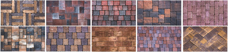 Collection of pictures about different modern an traditional paving for outdoor use made of stone, wood, pebbles and brick