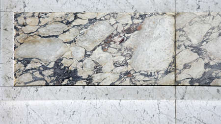 Top view of the old floor, made of various sized pieces of white and gray marble. Abstract black and white monochrome mosaic background.