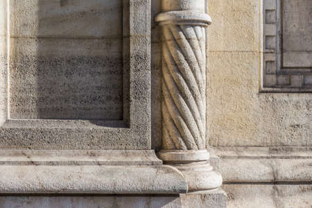 Decorative architectural detail of the entrance to a religious building. Marble column illuminated by the setting sun. Feltre, Belluno, Italy