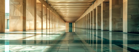 Grand columns rise above tranquil waters, creating a stunning reflection as the sun sets in the background.