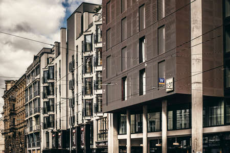 View of modern and historic buildings in Wroclaw, Poland, highlighting the blend of contemporary and traditional architectural styles.