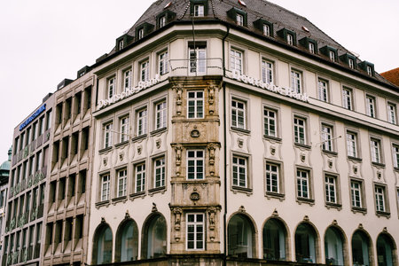 Many windows on facade of the urban historic building front view, Stockholm, Sweden