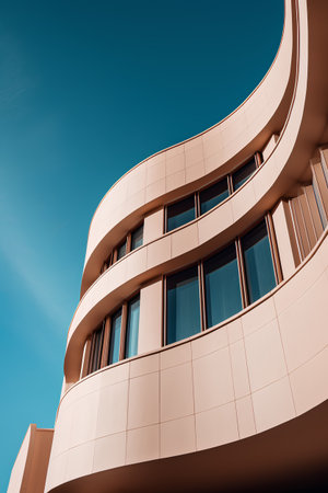 Low angle shot of a unique high rise orange building touching the blue sky. Generative AI AIG21.