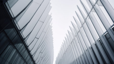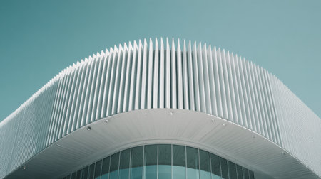 Horizontal shot abstract buildings with white metallic ribs and glass windows. Generative AI AIG21.