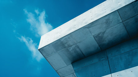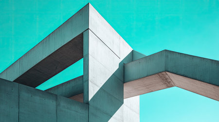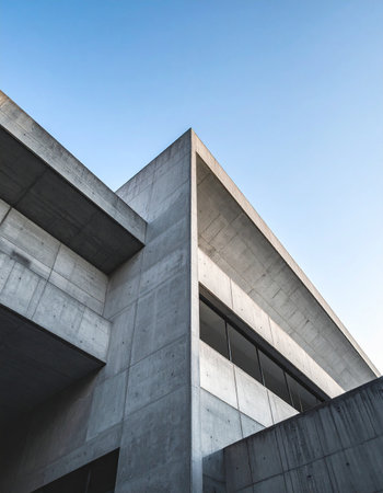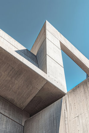 A striking image showcasing a minimalist concrete structure with geometric shapes, set against a clear blue sky, highlighting modern architectural principles.