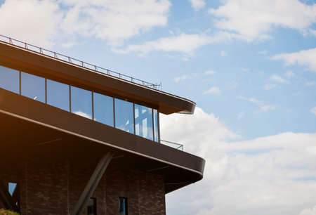 Modern building in the city with sunlight. Glass wall of an office building in the sunlight. Office building window close up with sunrise, reflection and perspective.