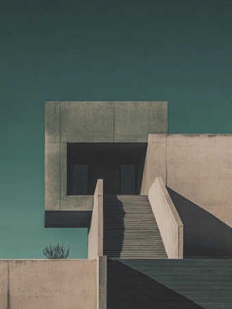 A geometric concrete house featuring a dramatic staircase leading to the entrance. The buildings sharp angles and minimalist design create a powerful architectural statement, emphasized by the contrasting shadows and the clear sky in the background.