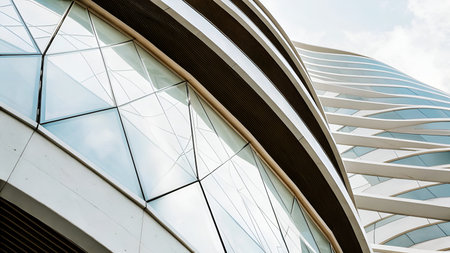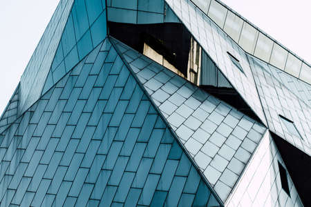 Architecture detail background. Skyscrapers exterior. Details of complex high rise building. Financial district. Glass facade building