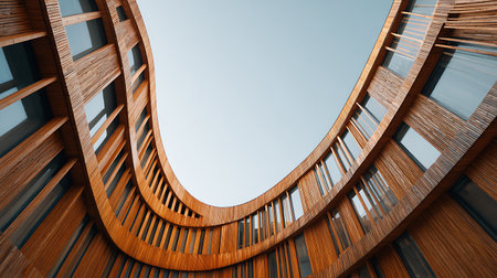 Low-angle shot showcasing a curved building facade featuring a wooden exterior and rectangular windows, contrasting against a clear blue sky. Modern architecture and design.